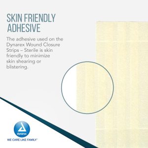 Dynarex Wound Closure Strips are crafted from non-woven materials reinforced with polypropylene fibers for enhanced durability. The sterile Strips feature a premium adhesive for secure wound closure, making them ideal for use following early suture or staple removal.