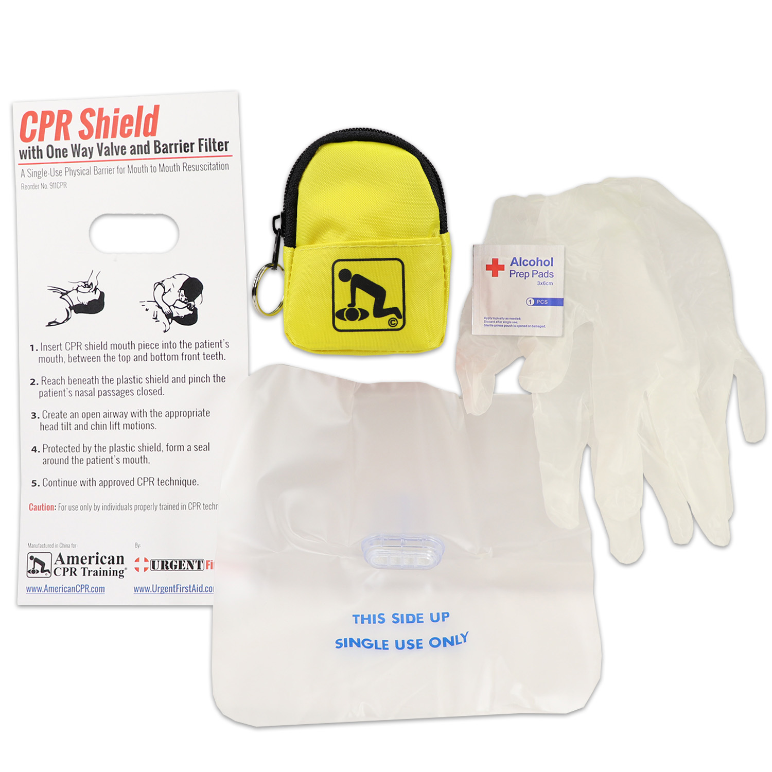 Mini backpack w/ belt loop and key ring includes CPR faceshield, 4 exam quality gloves, 1 personal antimicrobial wipe, Yellow, 1 set